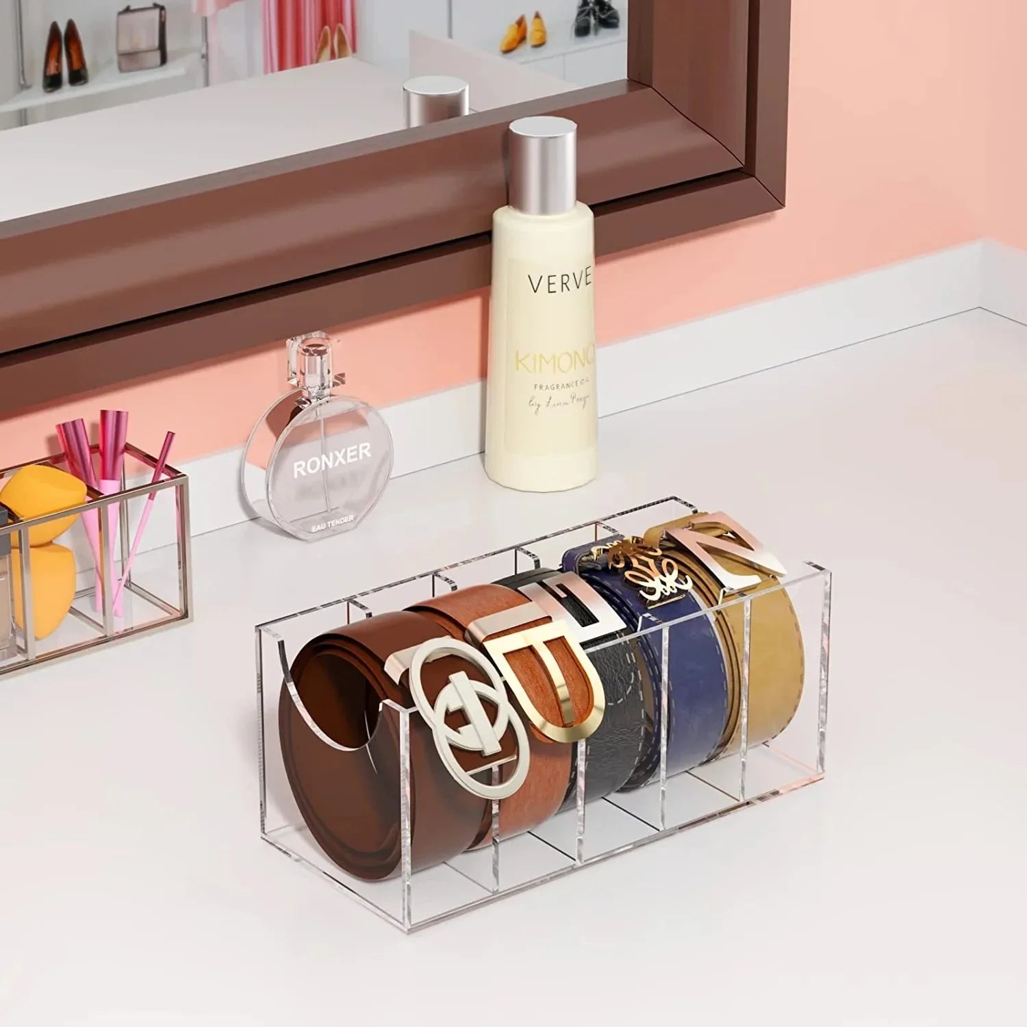 Visibilidade Total: O design transparente permite que você veja todos os seus cintos de uma só vez, facilitando a escolha do acessório perfeito para cada ocasião. Durabilidade: Feito de acrílico de alta qualidade, é resistente e durável, garantindo um uso prolongado sem perder a elegância. Economia de Espaço: Seu formato compacto é ideal para otimizar o espaço no seu guarda-roupa, mantendo tudo organizado sem ocupar muito espaço. Fácil de Limpar: A superfície lisa do acrílico facilita a limpeza, mantendo o organizador sempre com aparência de novo. Versatilidade: Além de cintos, pode ser usado para organizar outros acessórios como lenços, gravatas e bijuterias.5 compartimentos de exibição para gravata e gravata de arco